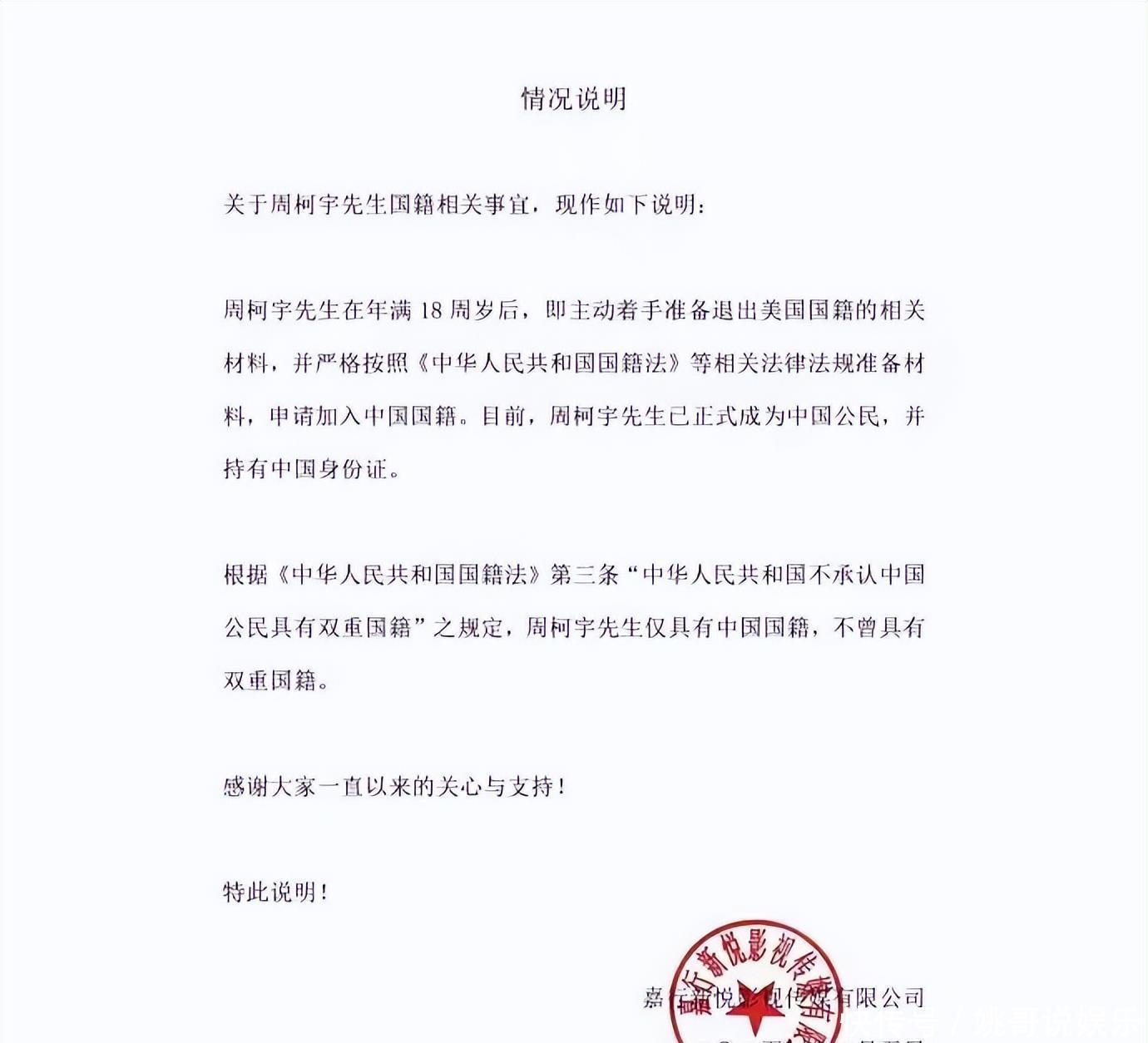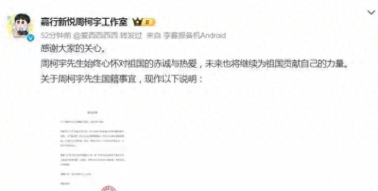 从近年来的种种迹象来看,年仅23岁的周柯宇很可能早已开始筹划国籍的变更。毕竟,除了法律层面的身份认定,他的整个事业版图和人际关系网络都深深扎根于国内。回归中国国籍,无疑是最符合他长远发展的明智选择,这也算是对多年来一直支持他的粉丝们的一个圆满回应。网络讨论发酵后,周柯宇的经纪团队第一时间发布了详细说明,透露这位年轻艺人在年满18岁后,就开始积极准备退出美国国籍的各项手续,并严格按照《中华人民共和国国籍法》及相关法规的要求进行材料准备,正式申请加入中国国籍。目前,周柯宇已成为中华人民共和国公民,持有中国身份证,未来将继续为国家的发展贡献自己的力量。周柯宇的个人资料显示,国籍一项已改为中华人民共和国,而美国则被重新定义为出生地点。