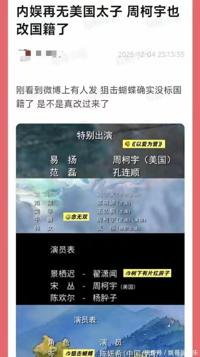 12月4日,《狙击蝴蝶》正式与观众见面,陈妍希携手周柯宇联袂出演。细心的网友很快捕捉到了一个微妙细节:演员名单里,周柯宇名字后面那个长期存在的"(美国)"字样消失了。这个不起眼的改动,瞬间点燃了网络讨论的火花,其经纪公司随即证实了这位年轻艺人已正式回归中国国籍的消息。这个变化之所以引起如此广泛的关注,原因在于此前的影视作品中,比如今年早些时候播出的《念无双》和《树下有片红房子》,他的国籍标识依然清晰可见。在当前影视行业对外籍演员身份标注有明确规定的背景下,这次的调整显得格外引人注目。