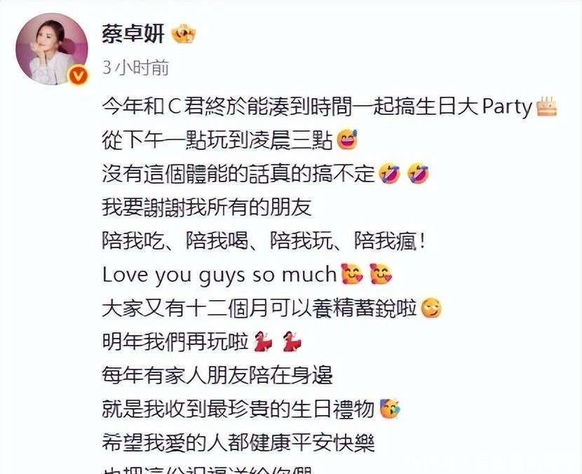 在阅读此文之前,辛苦您点击一下“关注”,既方便您进行讨论和分享,又能给您带来不一样的参与感,感谢您的支持!声明:本文内容均是根据权威材料,结合个人观点撰写的原创内容,辛苦各位看官支持。文丨娱乐太子2025年11月22日,蔡卓妍过了个挺特别的生日,从下午一点玩到凌晨三点,来的都是老朋友,容祖儿、关智斌、霍汶希这些熟面孔都在场,没有请媒体,也没有品牌赞助,就是一群认识多年的人聚在一起,聊聊天,吃吃饭,这种聚会现在很少见,大家都不太愿意花时间在“纯感情”上。